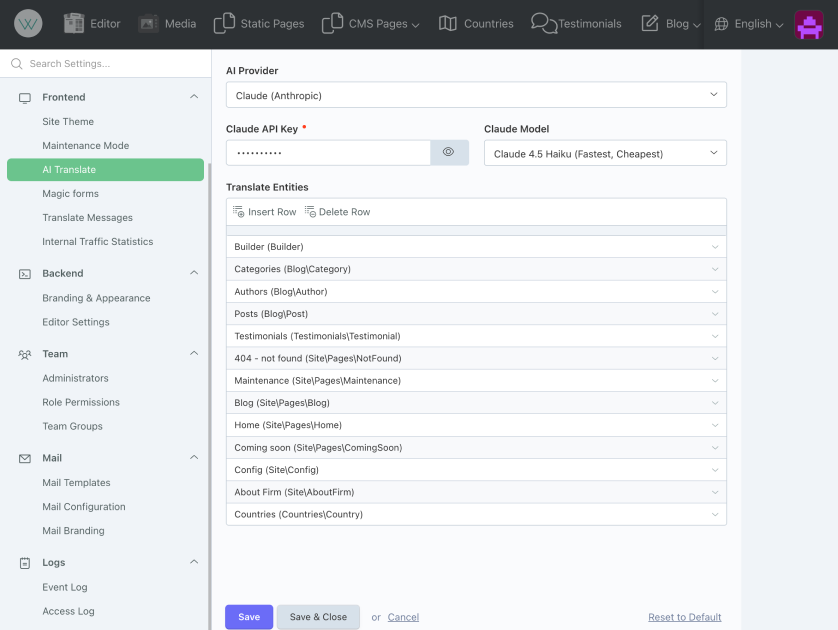 1) Go to Settings > CMS > AI Translate and select your preferred AI provider (OpenAI or Claude) and enter your API key.