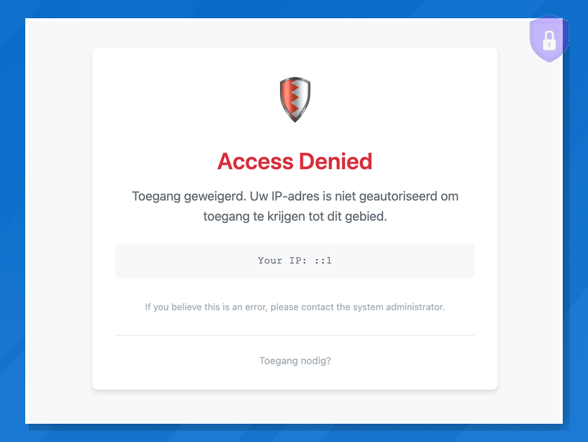 plugins/key/whitelist/ ├── Plugin.php # Main plugin registration & routes ├── middleware/WhitelistMiddleware.php # IP validation & emergency access check ├── controllers/EmergencyAccess.php # Emergency access request handler ├── models/ │ ├── Settings.php # Settings with IP parsing & validation │ └── EmergencyAccess.php # Emergency access request model ├── console/CleanupExpiredTokens.php # Artisan command for token cleanup ├── lang/ # Internationalization files │ ├── en/lang.php # English translations │ ├── nl/lang.php # Dutch translations │ ├── de/lang.php # German translations │ └── fr/lang.php # French translations ├── views/ │ ├── blocked.htm # Professional error page │ └── mail/ │ ├── emergency_access_request.htm # HTML email template │ └── emergency_access_request.txt # Plain text email template ├── updates/ │ ├── version.yaml # Version tracking │ └── create_emergency_access_table.php # Emergency access database migration ├── EMERGENCY_ACCESS.md # Complete emergency access documentation └── README.md # This file