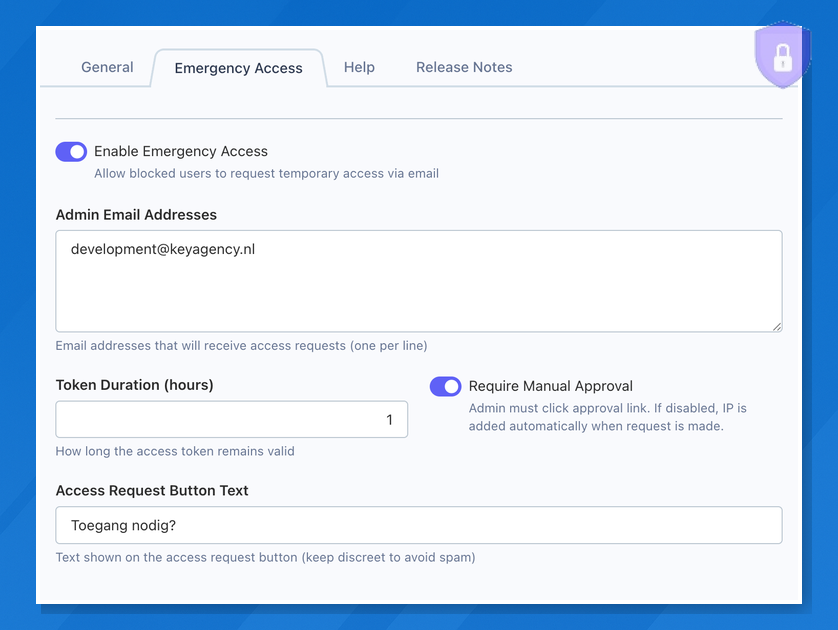 - Admin Email Addresses: Email addresses that receive access requests (one per line)