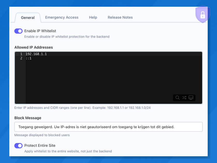- Protect Entire Site: Apply whitelist to entire website (not just backend)