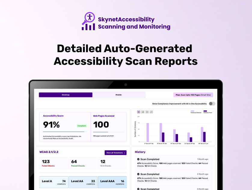 The SkynetAccessibility Scanner Application is a powerful Accessibility Testing Tool and Accessibility Scanning Software that enables organizations, businesses, government entities, and individuals to proactively scan, monitor, and remediate accessibility compliance issues. It functions as both an Accessibility Checker and Accessibility Compliance Testing Software, ensuring websites and applications meet global and regional accessibility standards.