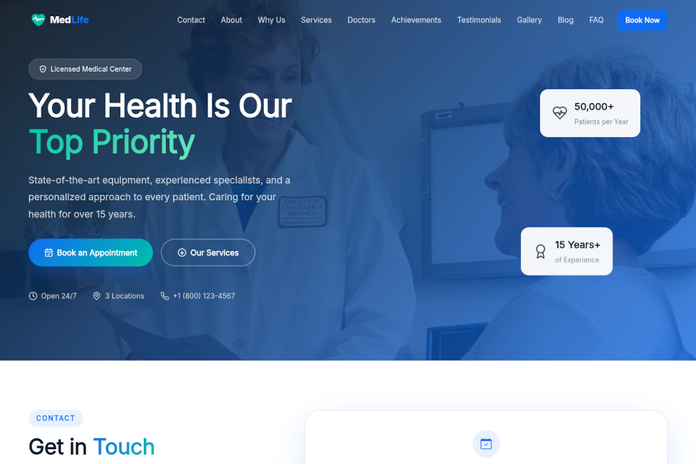 MedLife is a modern, high-quality theme designed for medical clinics, healthcare centers, hospitals, and private practitioners. It combines a clean, trustworthy design with powerful built-in functionality to help you launch a professional medical website quickly and efficiently.